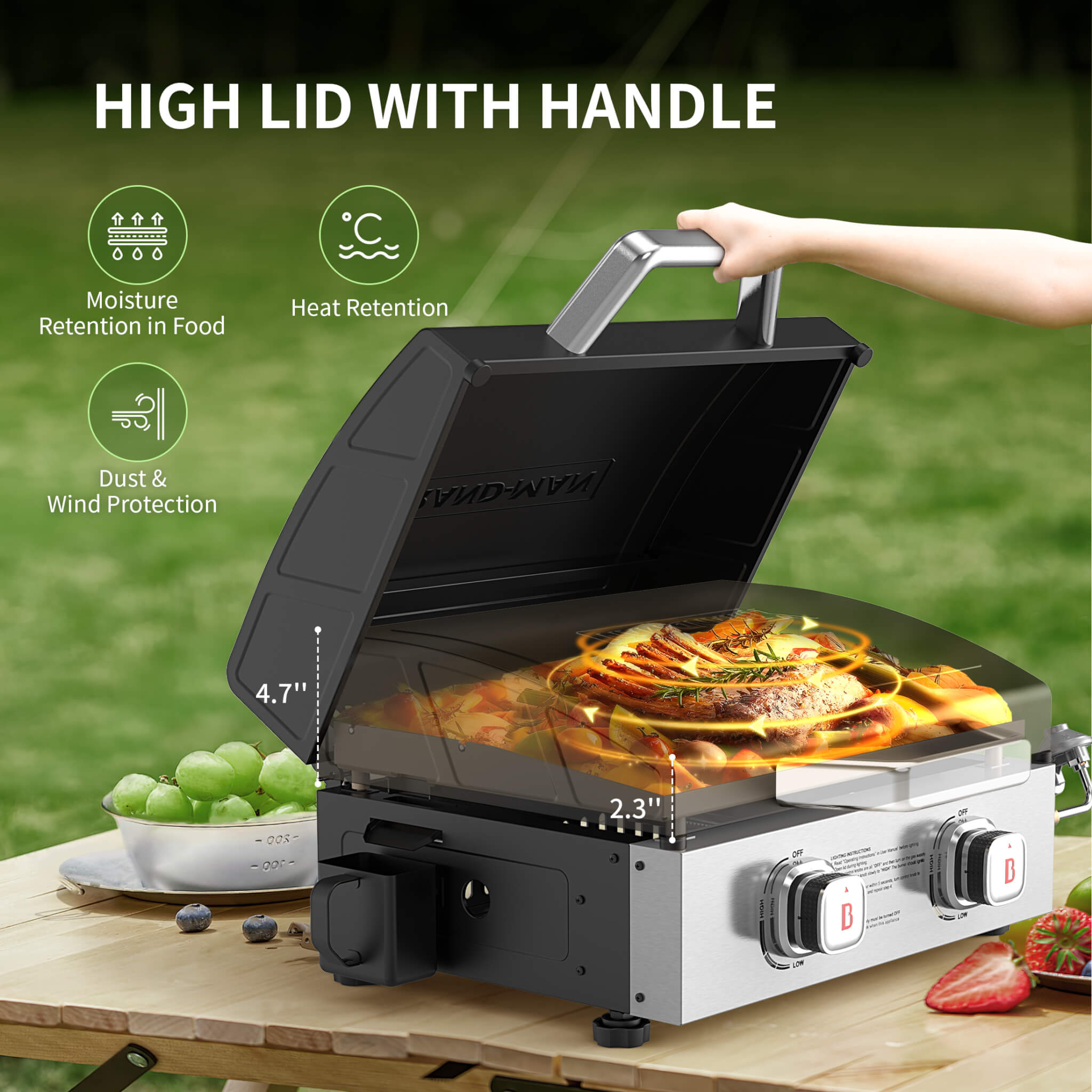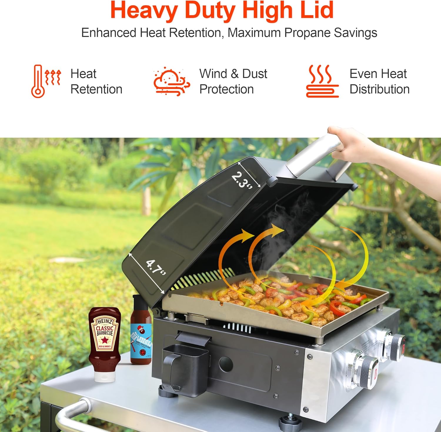 【High Quality Built】Built with high-quality stainless steel and a heavy-duty design, making it very durable. The built-in Hood protects the griddle and food in unexpected weather or when griddle is not in use