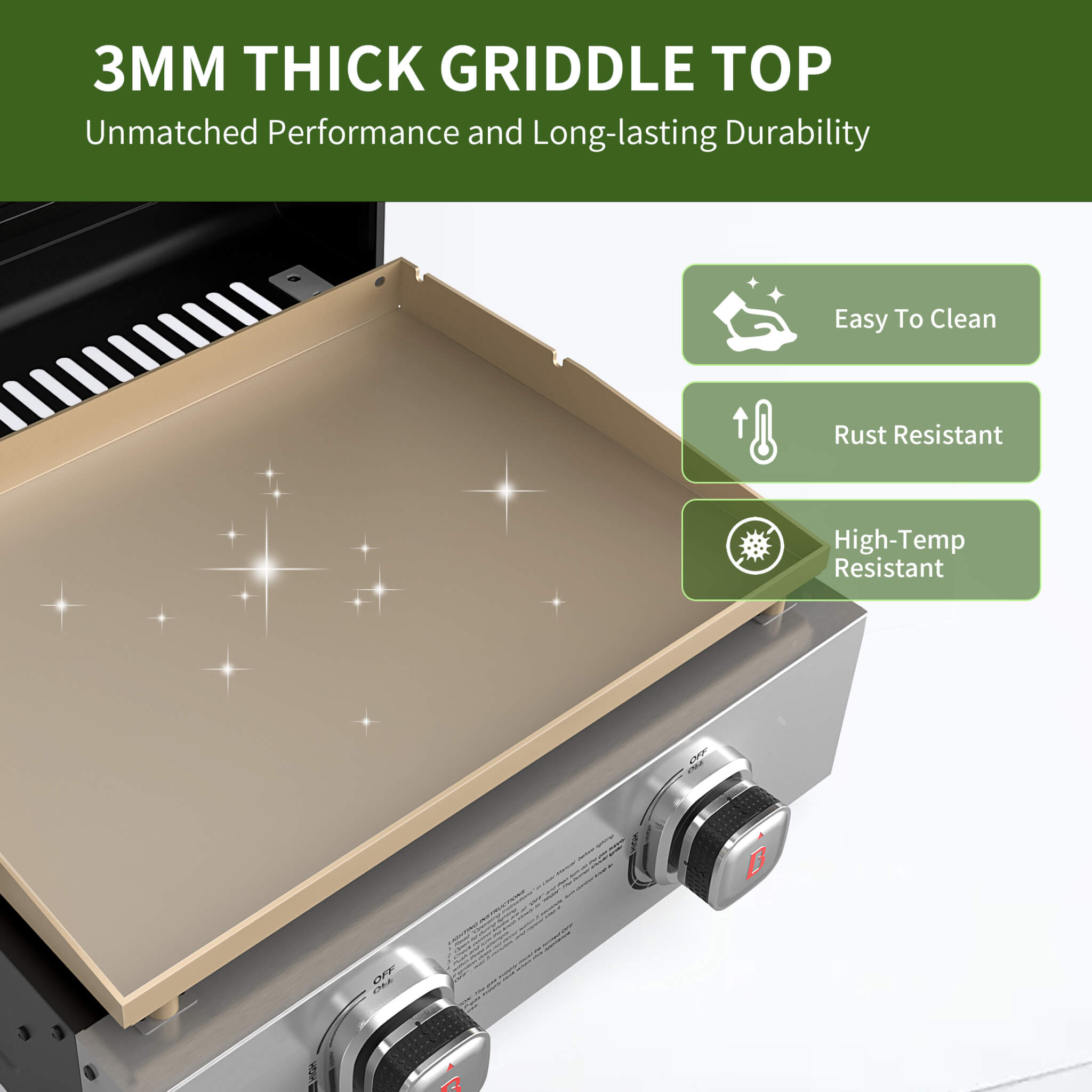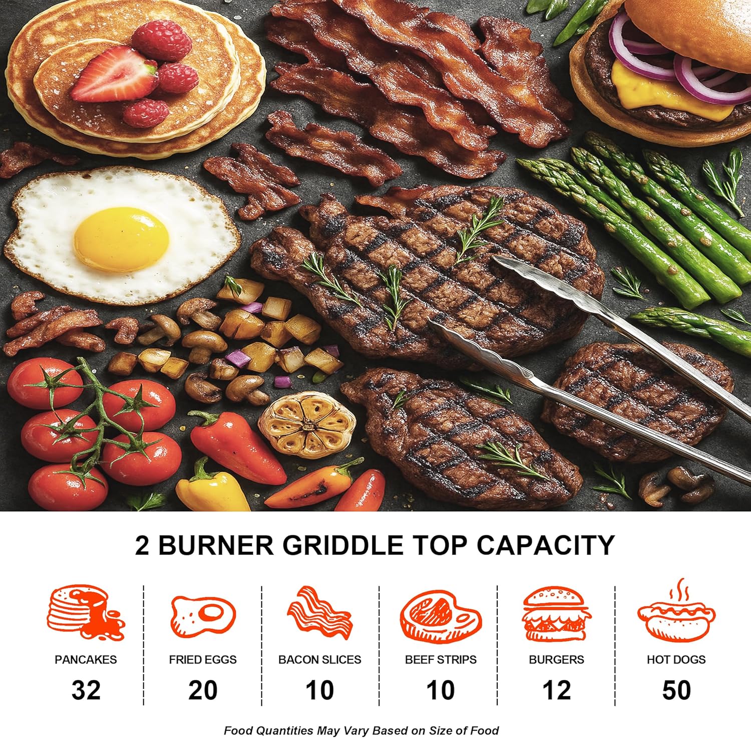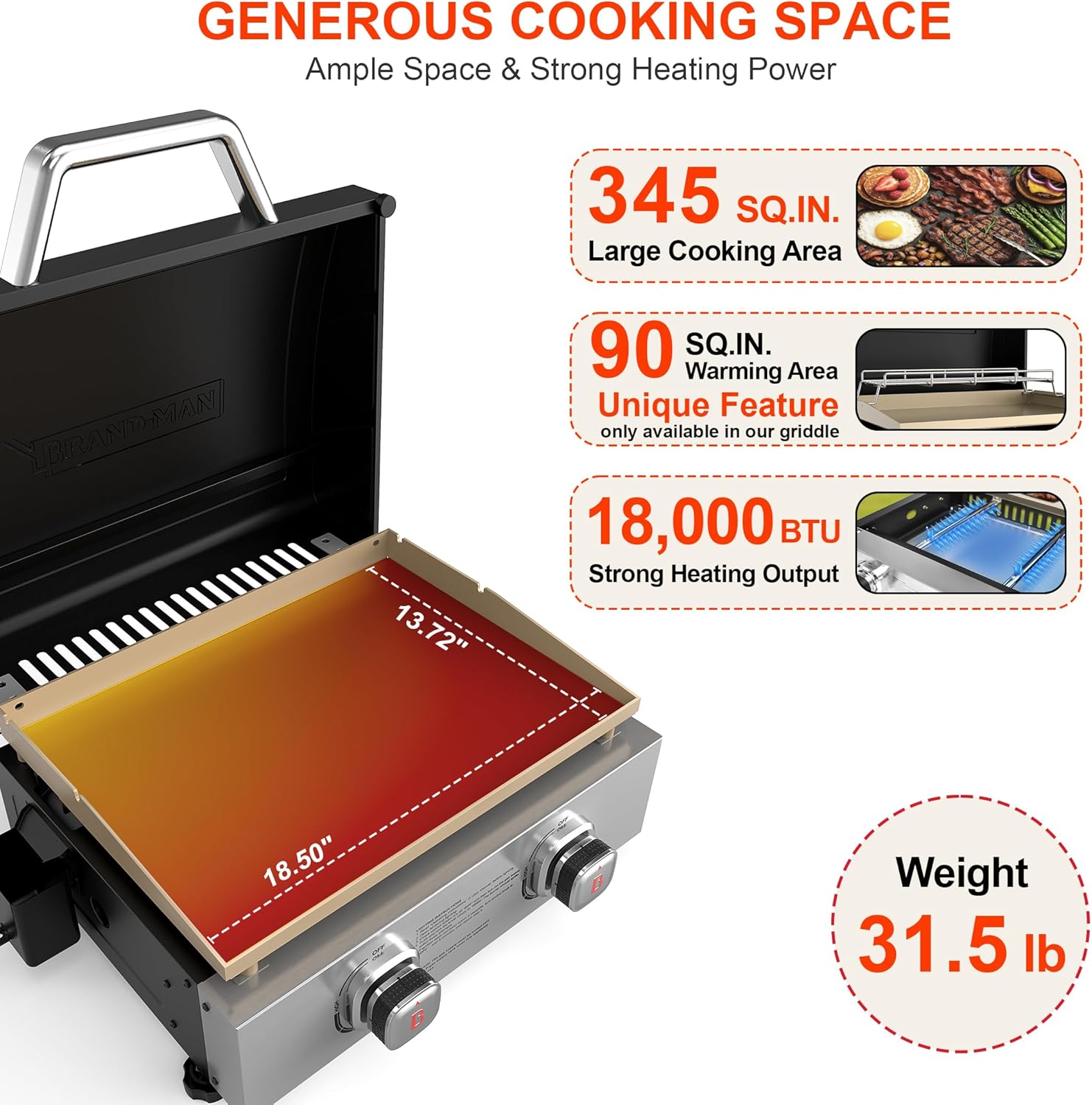 【Powerful Heating】Our product is equipped with 2 independent stainless steel burners, providing 18,000 BTUs of heat each with independent control knobs for precise temperature adjustments, allows a variety of cooking options. Whether cooking eggs, pancakes, grilling cheese, or steak, you can do it all with ease