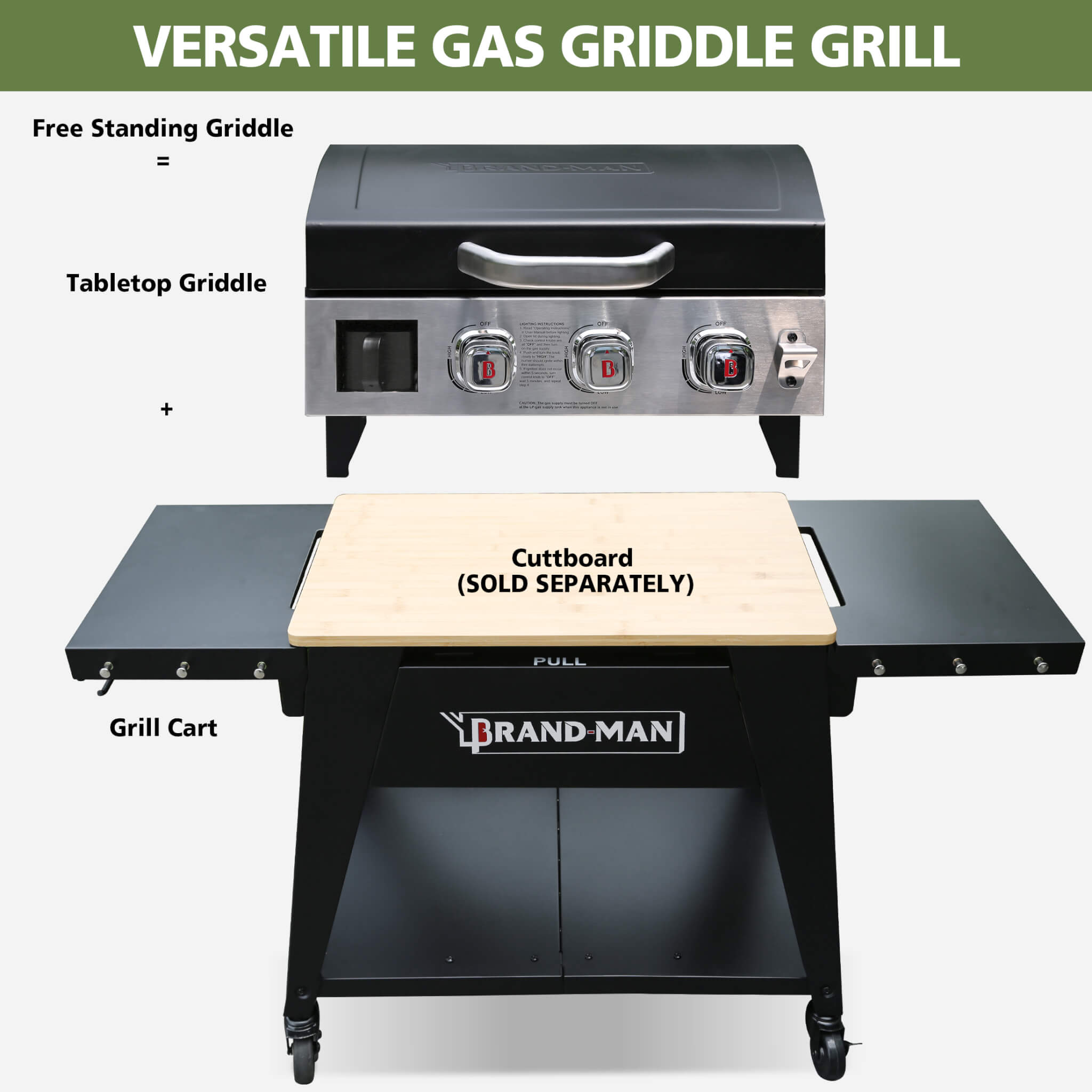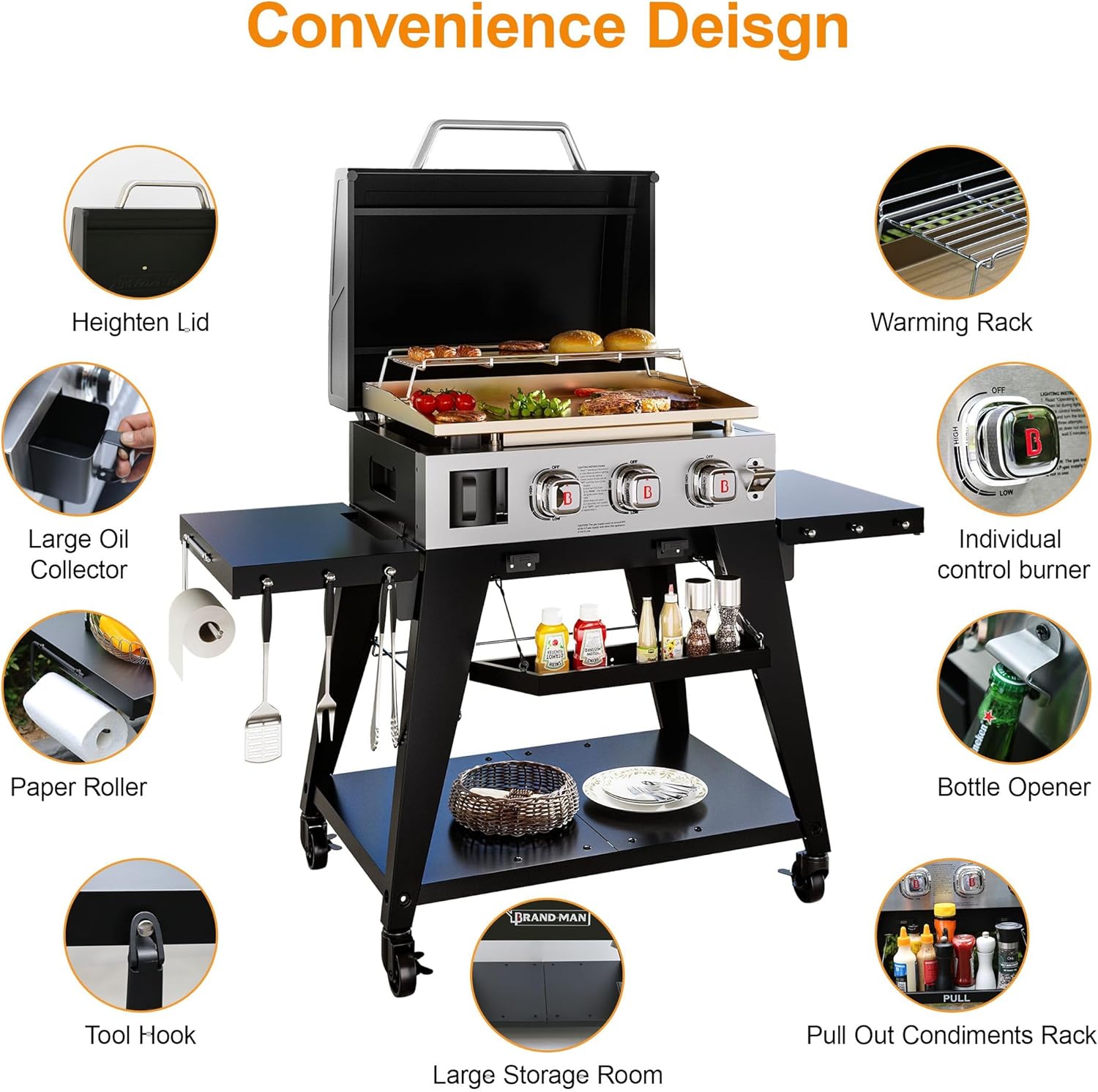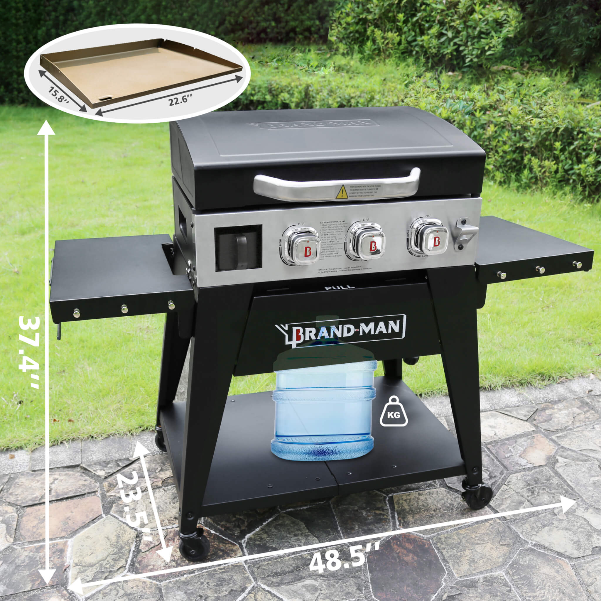 Brand-Man 3-Burner Portable Propane Gas Griddle with Lid – 28,000 BTU Flattop Griddle Grill, 504 Sq. In., Folding Side Tables, Rolling Cart for Outdoor BBQ, Camping, Patio