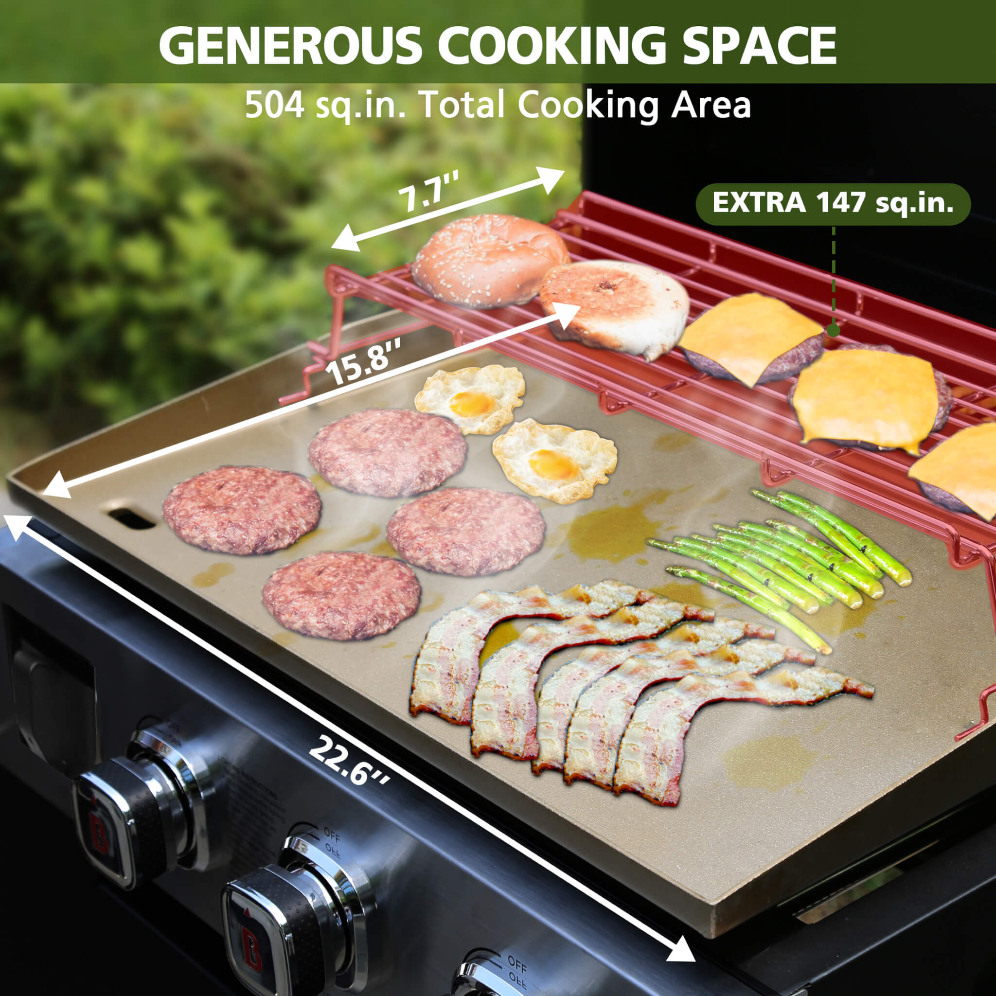 Flat top griddle grill: The 504 sq. in. flat top cooking surface Including 147 sq. in. warming rack, ideal for cooking chicken, steak, vegetables, and hot dogs, accommodates up to 33 burgers or 13 steaks at once