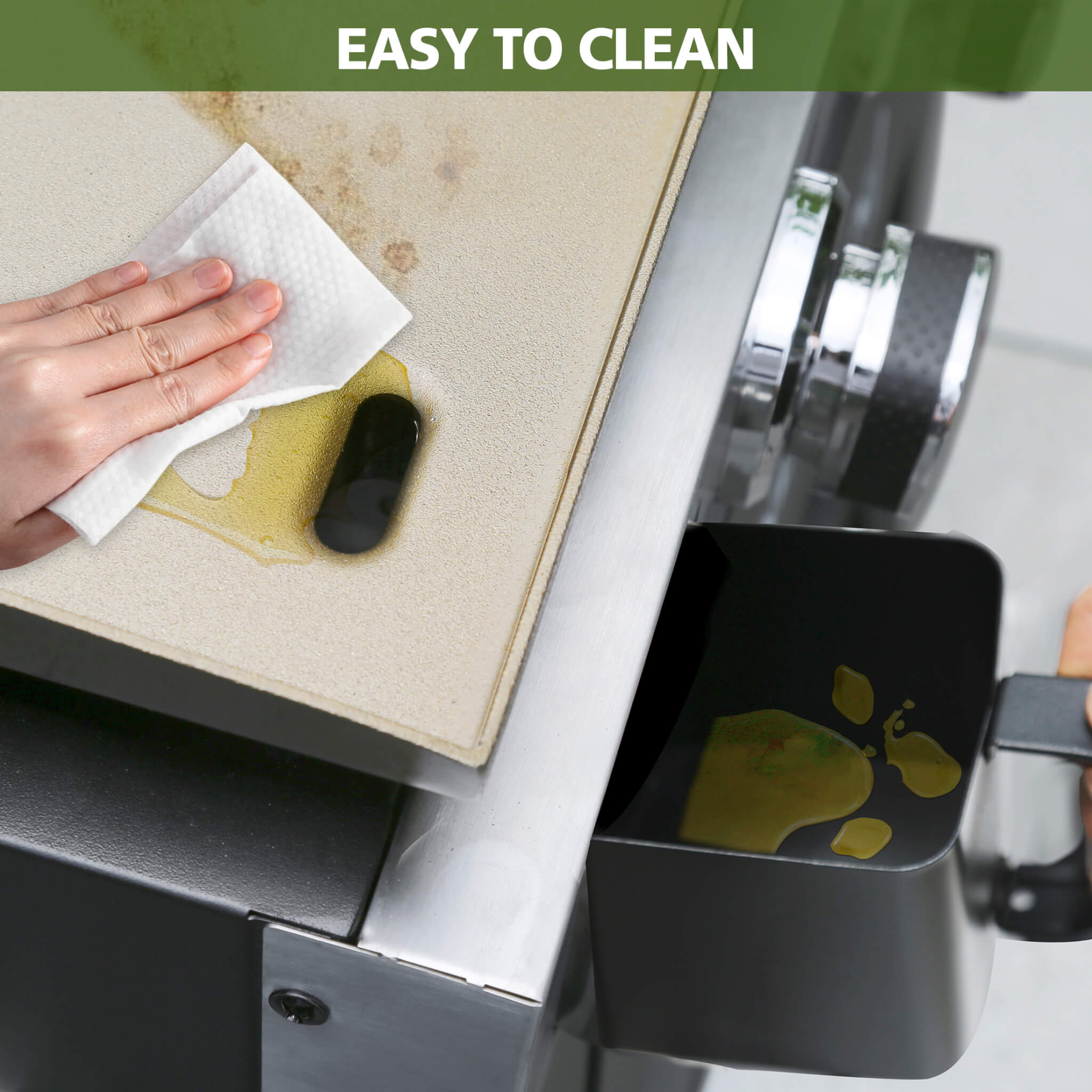 Quick & Easy Cleanup: Large capital grease cup with easy clean griddle grill pan, bring you more convenience during cooking and after cleaning
