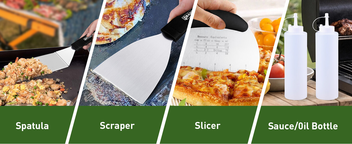 All-in-One BBQ Tool Set: This comprehensive set includes a durable spatula, scraper, slicer, and two reusable sauce bottles—everything you need for a successful barbecue
