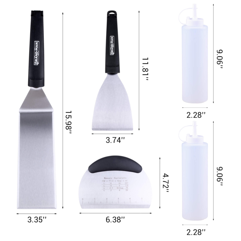 Brand-Man 5-Piece Professional Griddle Accessory Toolkit, Grill Spatula Set with 1 Enlarged Spatulas, 1 Scraper, 1 Slicer and 2 PET Sauce Bottle