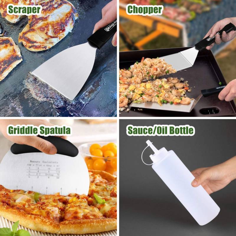 Easy to Clean: All tools are dishwasher safe and clean up effortlessly with warm, soapy water. For best results, dry spatulas and scrapers after washing to prevent rust. The reusable sauce bottles add convenience to your post-grill cleanup