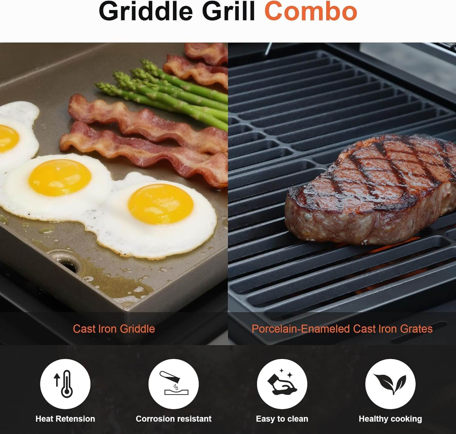 Whether you’re craving the smoky taste of charcoal-grilled meats or the speed and convenience of gas cooking, this grill has you covered. Fire up the grate for those perfect grill marks on your steaks and burgers, or switch to the griddle for a sizzling breakfast of pancakes, eggs, and bacon.