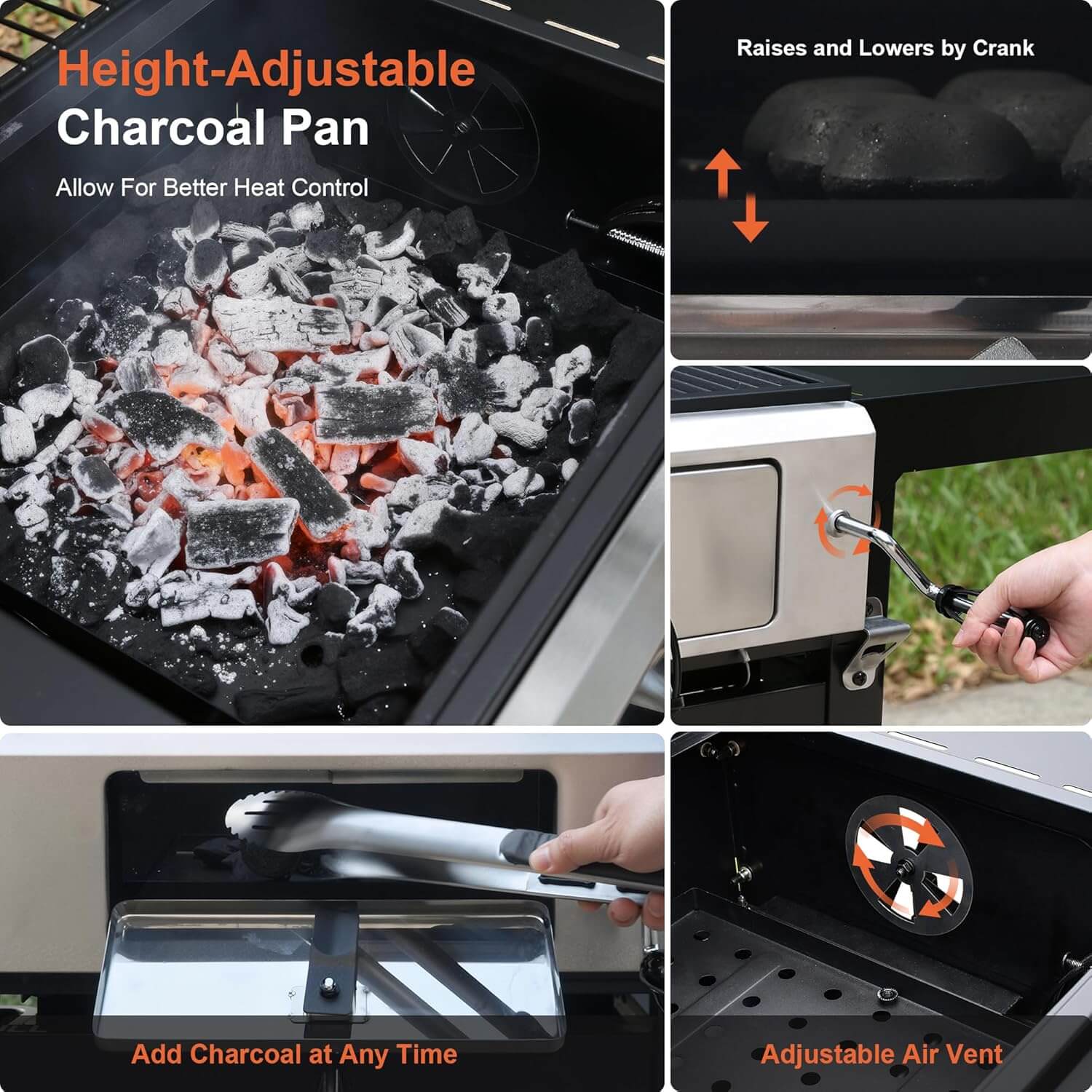 OPTIMIZED AIRFLOW: Our grill’s side damper ensure excellent airflow, reducing heat loss and giving you control over the flame. Adjust the charcoal pan height for perfect heat distribution and grilling results every time