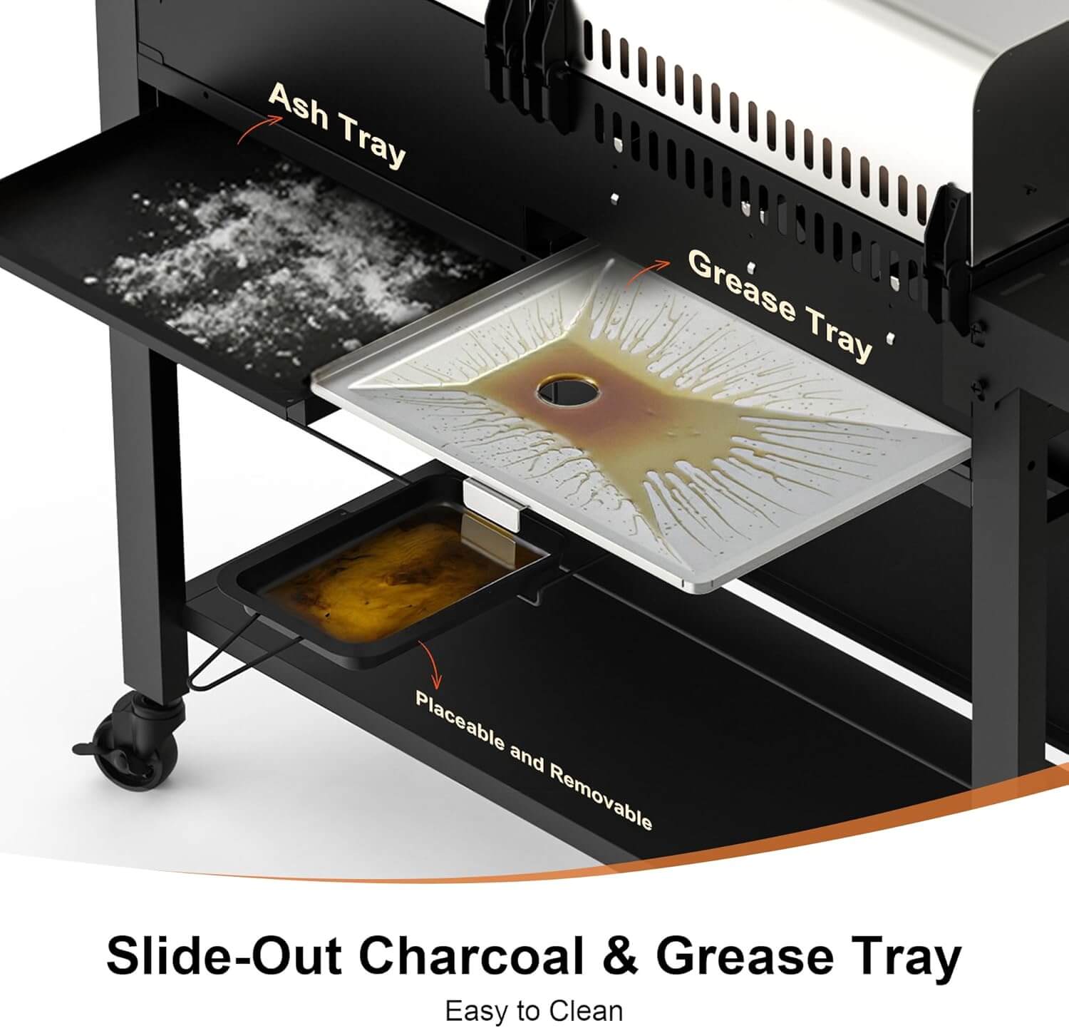 NO FUSSY CLEANUP: Slide out the ash tray for easy cleanup of the charcoal grill, and remove the grease cup/tray for the gas grill. Full-sized, slide-out design simplifies post-BBQ cleaning