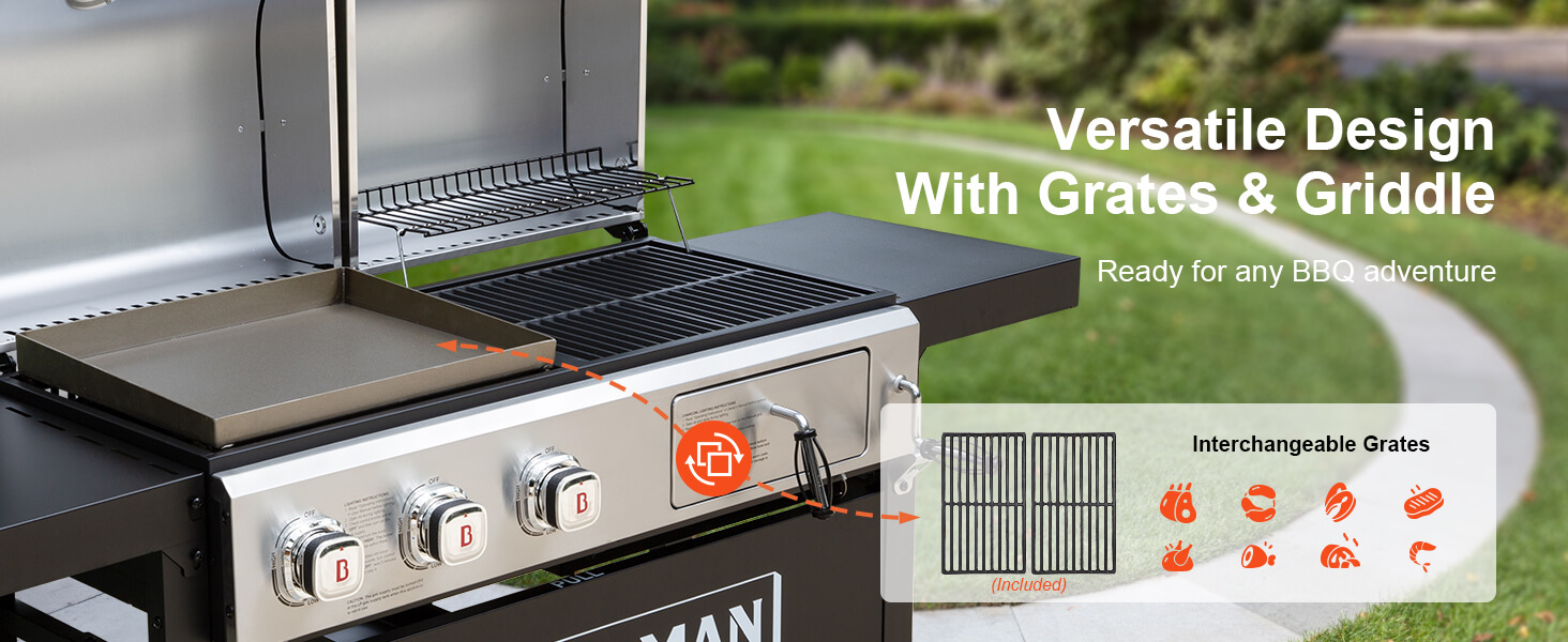 Why settle for one when you can have BOTH? Grate & Griddle Meets Gas & Charcoal Combo Grill – your ticket to endless cooking possibilities