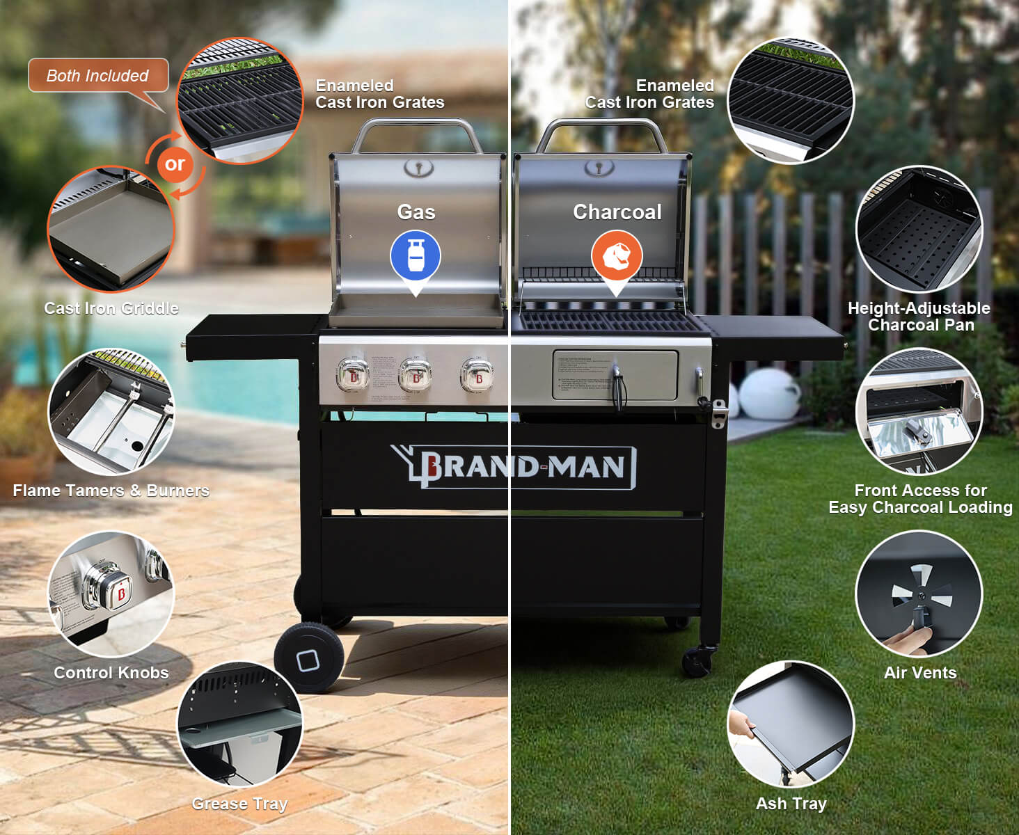Brand-Man Propane Gas and Charcoal Grill Combo,Grill and Griddle Combo Dual Fuel BBQ Grill with Dual Lids for Outdoor Barbecue, Black