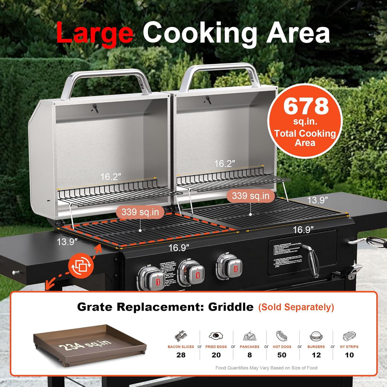 | Cooking Surface Area | 678 Square Inches |