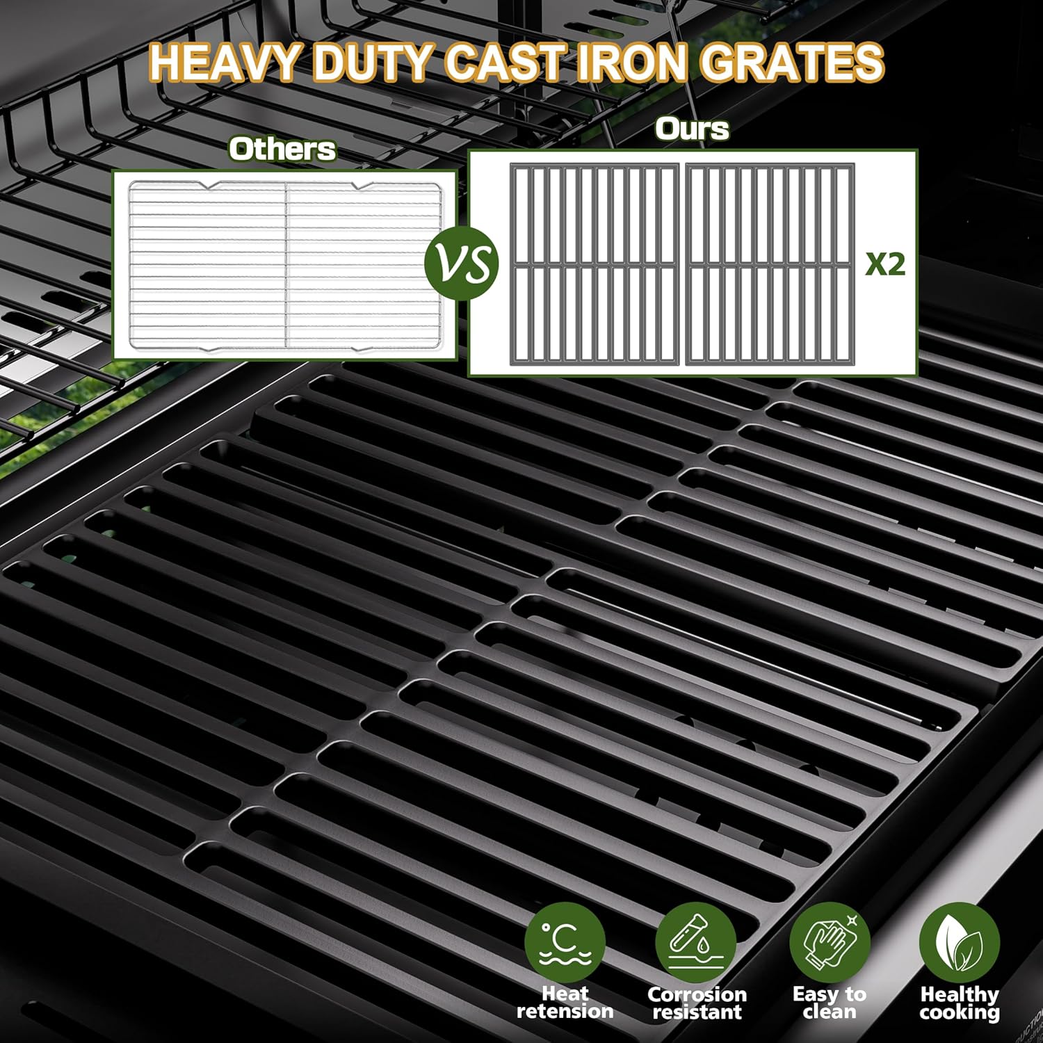 678 sq.in. MASSIVE BBQ SPACE: Our grill combines a spacious 472 sq.in. cast iron cooking area with a 206 sq.in. warming rack, perfect for large gatherings. Heavy-duty cast iron grates provide lasting durability and rust resistance, ensuring your grill stands the test of time