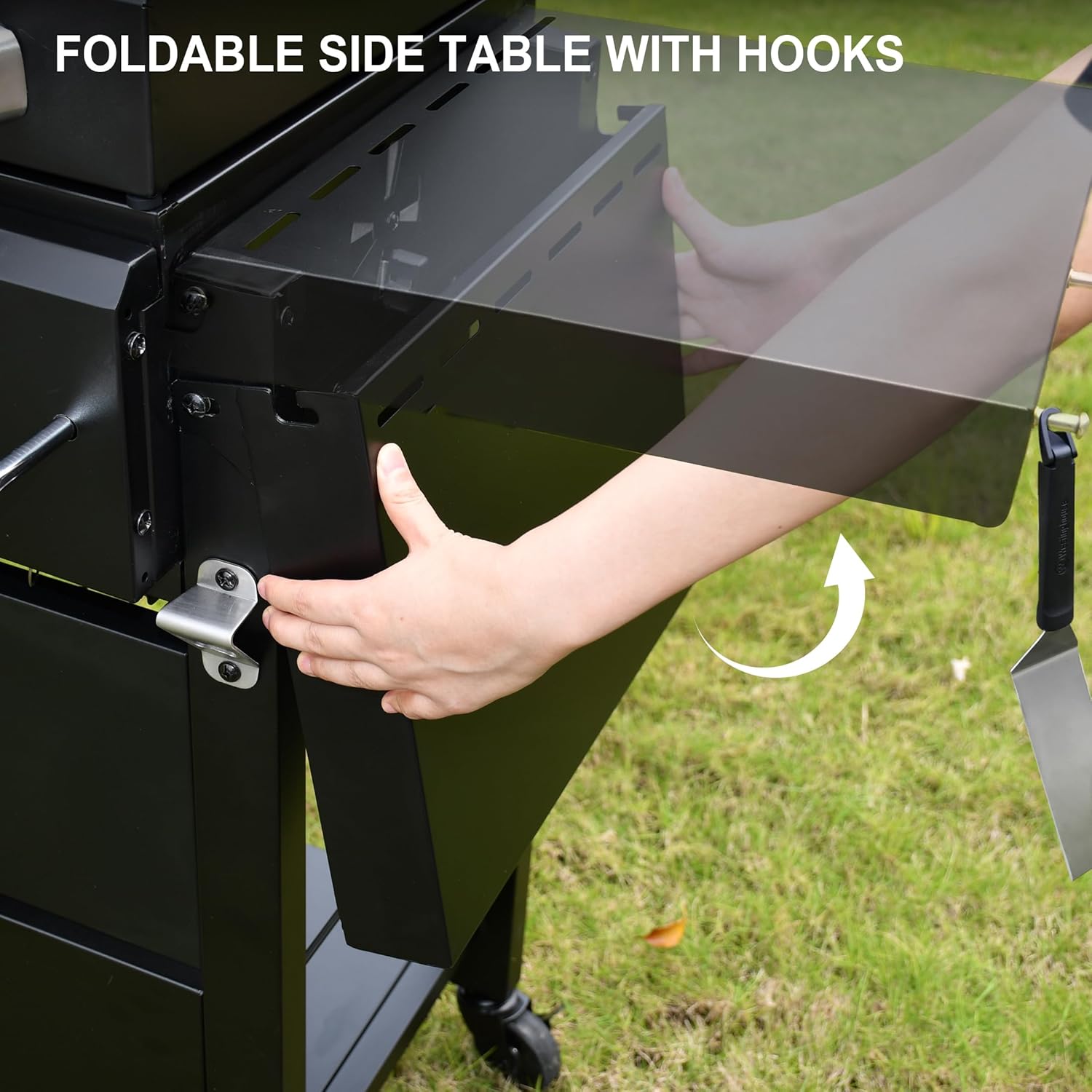 EFICIENCY MEETS ORGANIZATION: The front panel transforms into a convenient condiment station for organizing seasonings, while dual foldable shelves provide ample space for plates and prep work. Tool hooks keep your grilling essentials within easy reach