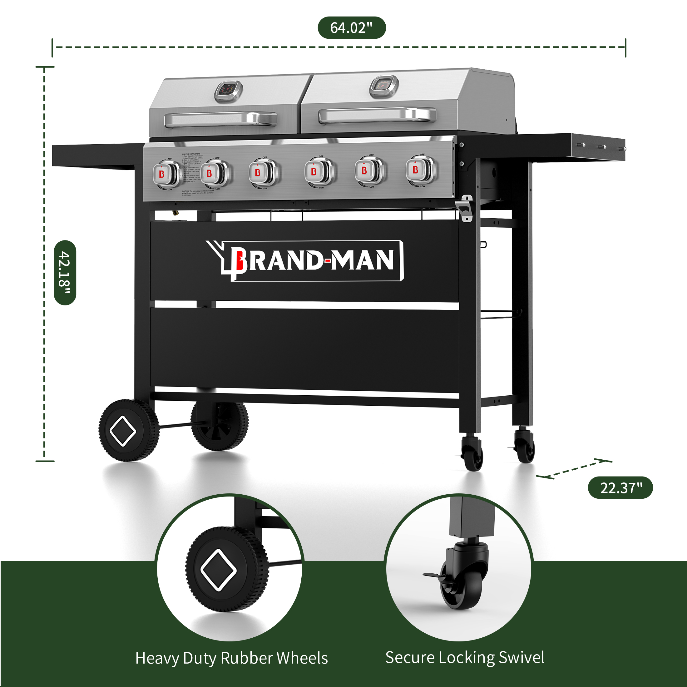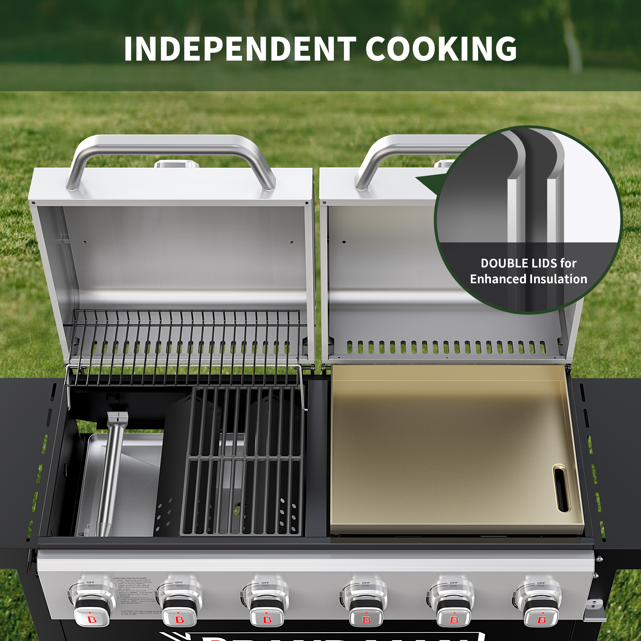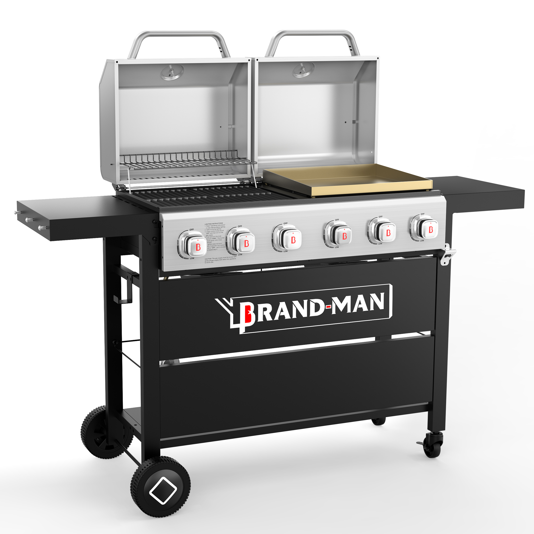 Brand-Man Griddle Grill Combo 6-Burner, 2 in 1 Versatile Propane Gas Grill and Griddle with Double Stainless Steel Lids, BBQ Combo for Outdoor Kitchen & Backyard Barbecue Cooking