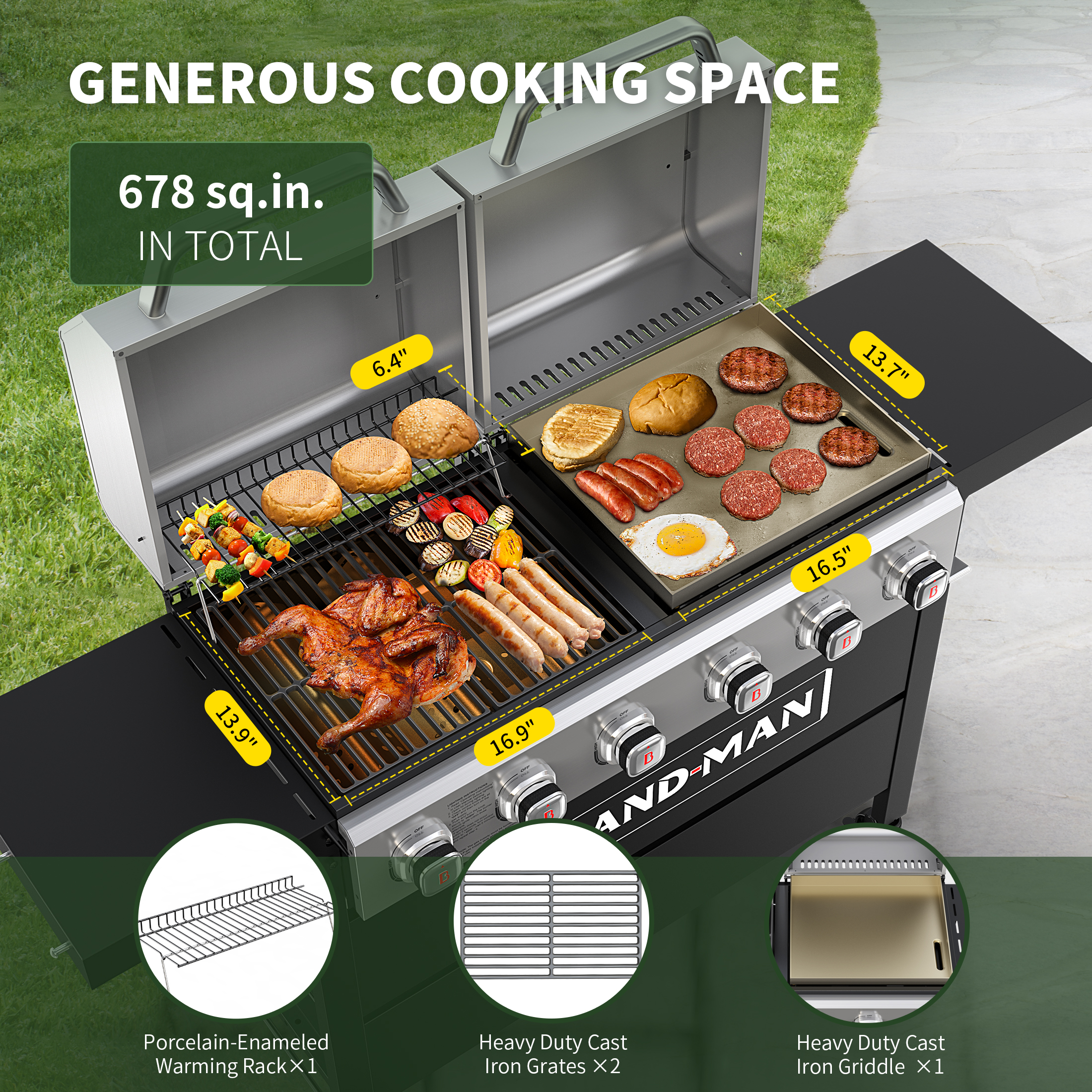 SPACIOUS GRILLING SPACE: Experience 678 sq.in. of ample cooking area, featuring durable cast iron grates and a porcelain-enameled warming rack, perfect for large, enjoyable BBQs with family and friends