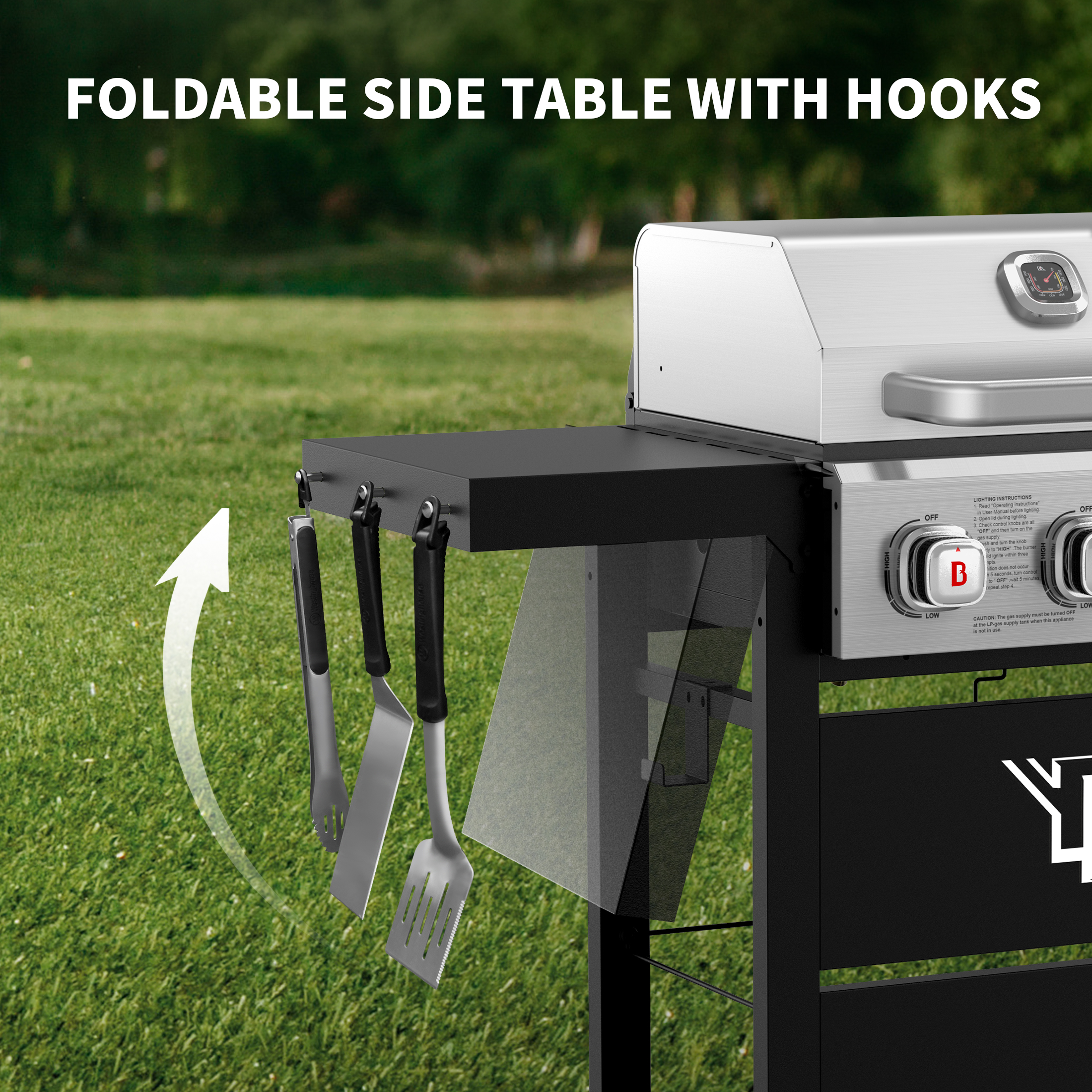 EFFECIENT GRILLING ORGANIZATION: The front panel turns into a condiment station, and foldable shelves provide extra space for plates and prep. Tool hooks keep your grilling tools close, streamlining your cooking process