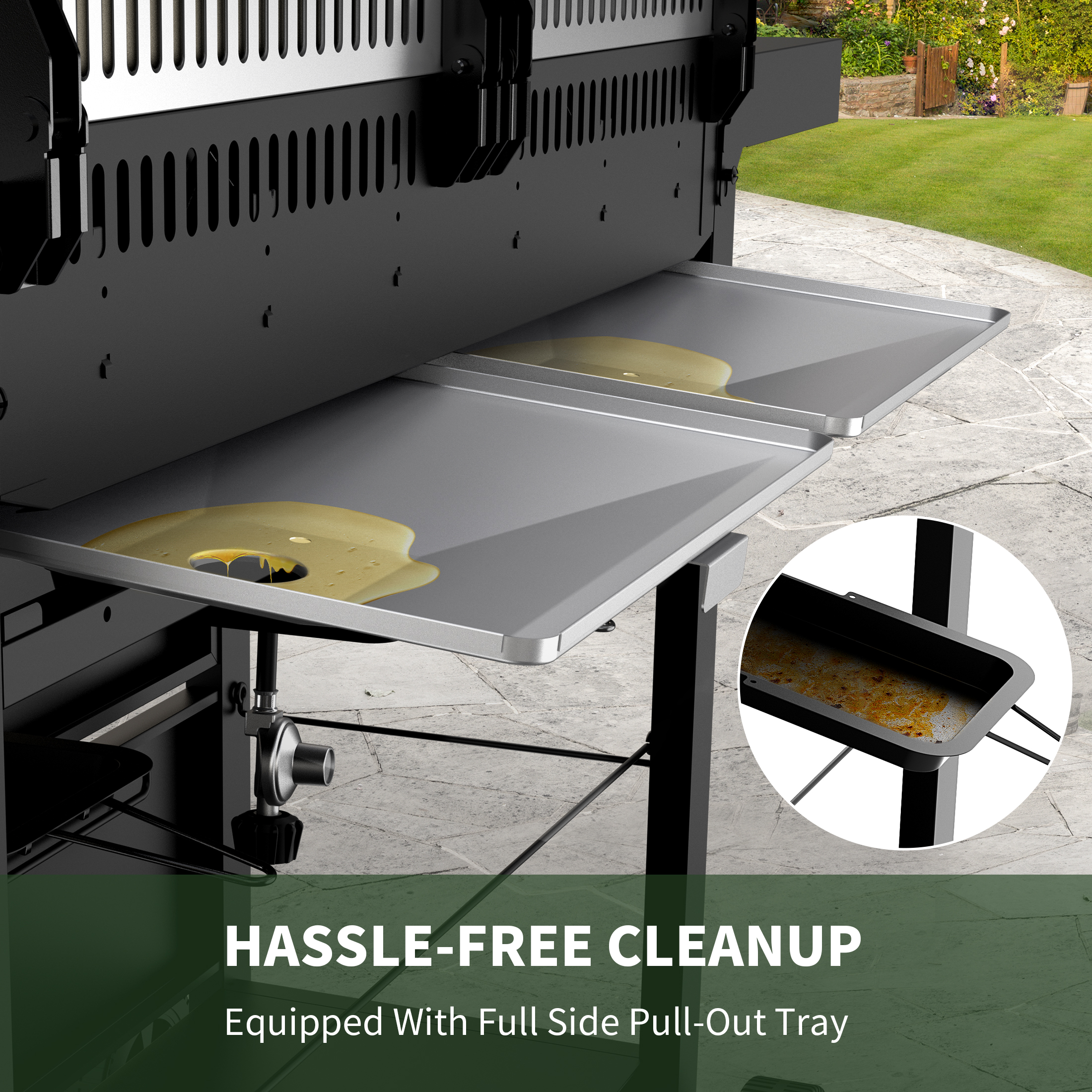 EFFORTLESS CLEANUP: Experience the ease of post-BBQ cleaning with our full-sized, slide-out grease tray. Simply slide out to remove grease and residues, making cleanup a breeze and keeping your grill ready for the next delicious meal