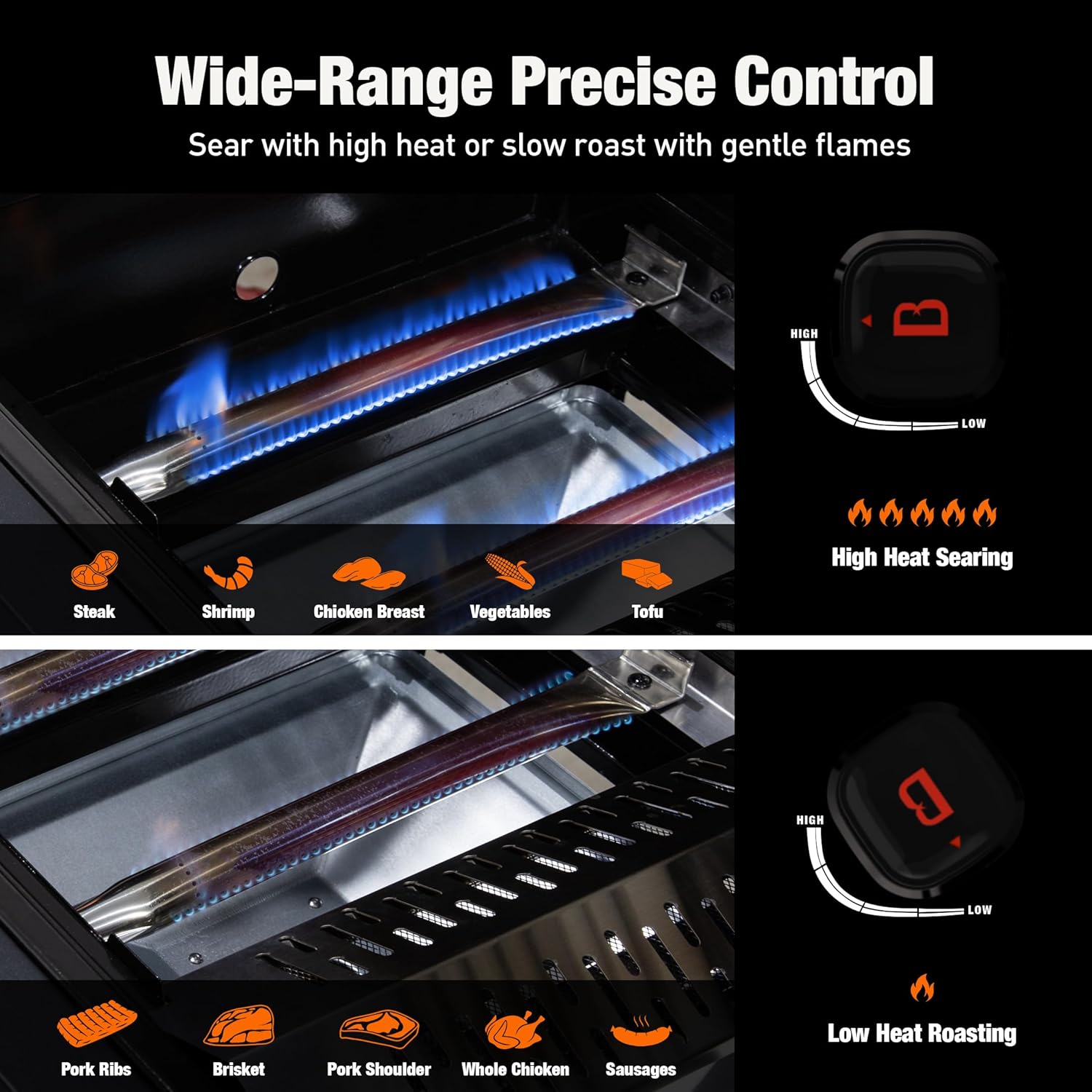 Pro-Level Flame Control: Our grill delivers a true low flame for slow-roasting – A feature not found on most outdoor grills! Seamlessly switch between high-heat searing (for ribeyes with a caramelized crust) and low-and-slow roasting (for fall-off-the-bone brisket or tender veggies) Pro-Level Flame Control: Our grill delivers a true low flame for slow-roasting – A feature not found on most outdoor grills! Seamlessly switch between high-heat searing (for ribeyes with a caramelized crust) and low-and-slow roasting (for fall-off-the-bone brisket or tender veggies)