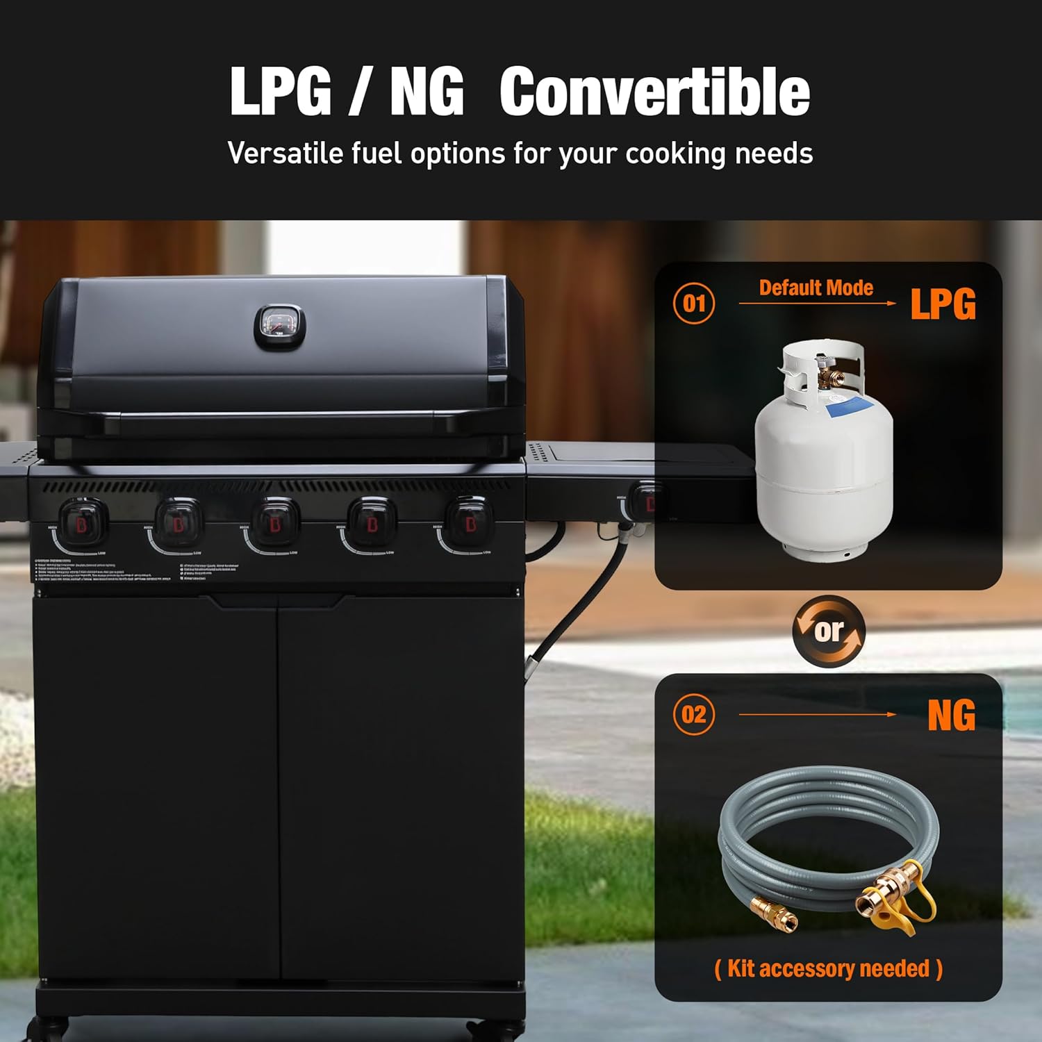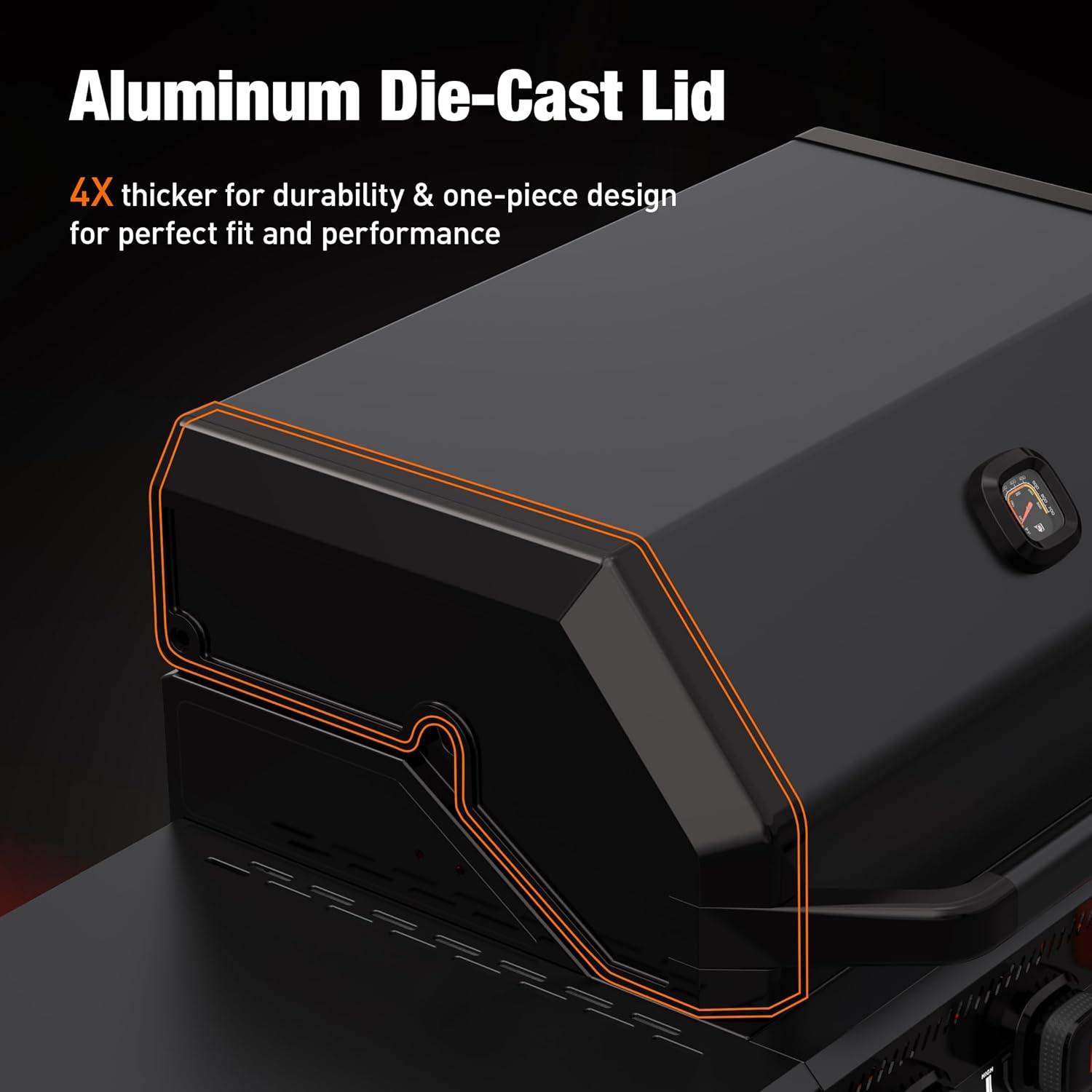 Convenience & Durability: Engineered for lasting quality and effortless grilling, our die-cast aluminum lid delivers superior heat retention while staying lightweight. Enjoy fuel flexibility—switch between propane and natural gas seamlessly with our hassle-free conversion Convenience & Durability: Engineered for lasting quality and effortless grilling, our die-cast aluminum lid delivers superior heat retention while staying lightweight. Enjoy fuel flexibility—switch between propane and natural gas seamlessly with our hassle-free conversion