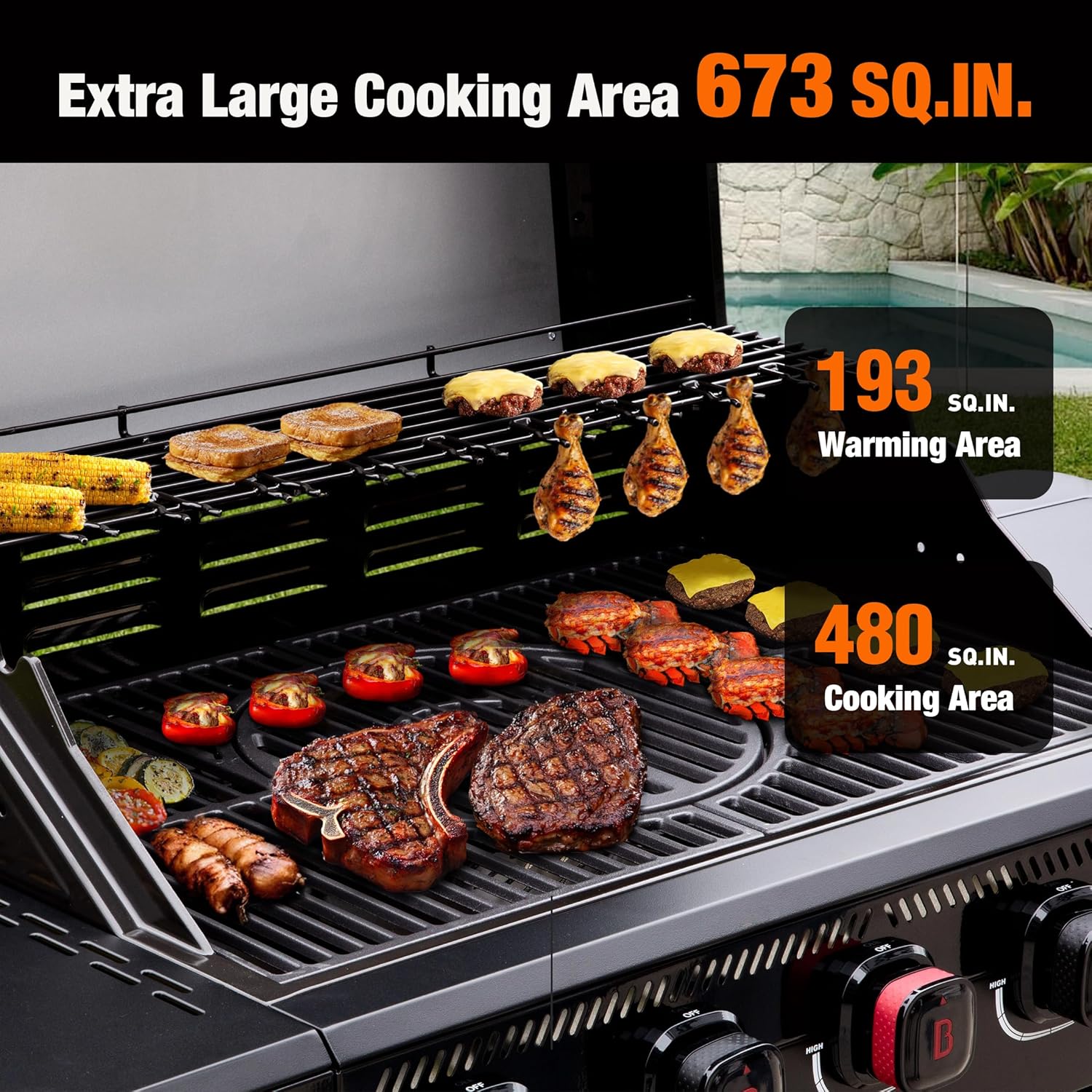 Spacious & Organized: Enjoy 30% more space than standard grills with our expansive 673 sq.in. cooking area. The built-in chicken hanger roasts legs vertically while the warming rack keeps food hot – grill large batches effortlessly without crowding Spacious & Organized: Enjoy 30% more space than standard grills with our expansive 673 sq.in. cooking area. The built-in chicken hanger roasts legs vertically while the warming rack keeps food hot – grill large batches effortlessly without crowding