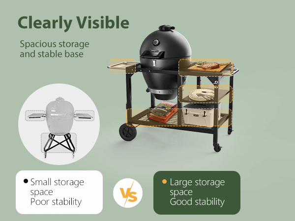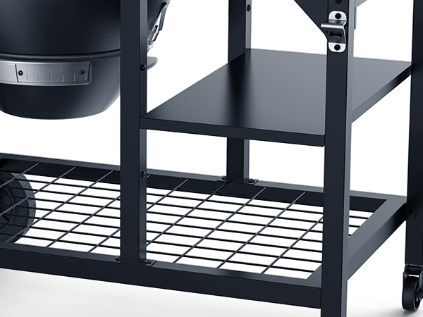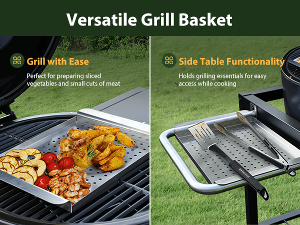 CONVENIENT DESIGN: Easily grill sliced vegetables and small meats with our durable grilling basket for even cooking and easy flipping. Enjoy a large prep area and ample storage for all your grilling needs. Robust wheels and stable legs ensure effortless mobility and reliable support