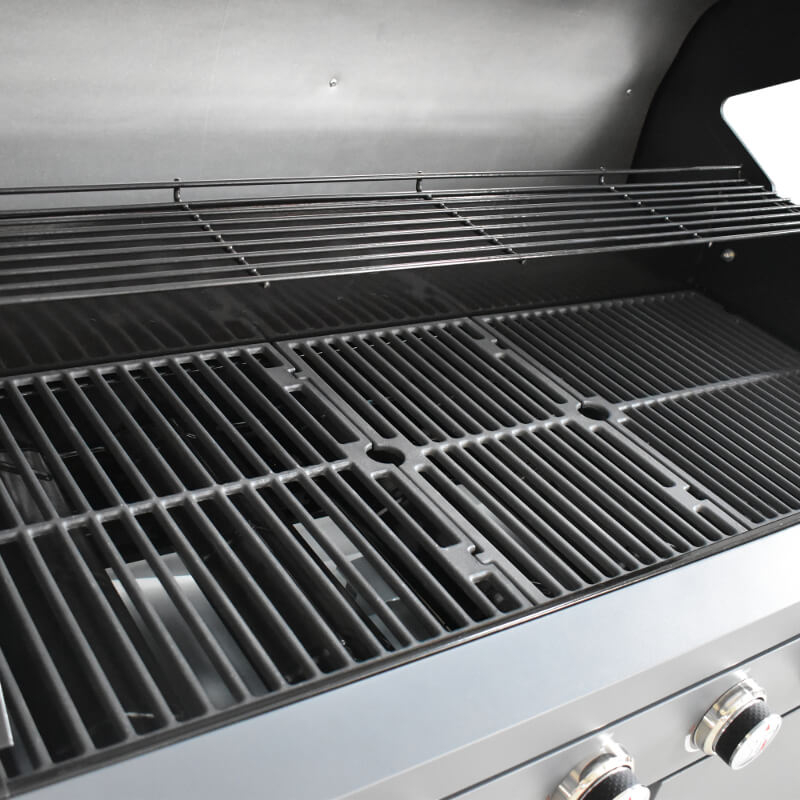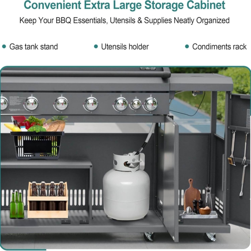 | Special Features | Cast Iron Griddle Plate INCLUDED, Durable Stainless Steel Burners, Enameled Flame Tamers, Individually Controlled Knobs, Fold-out Prep Table, Enclosed Cabinet, Lockable Swivel Casters, Heavy Duty Cast Iron Grates, Tool Holder, Paper Towel Holder, Bottle Opeaner, Grease Cup |
