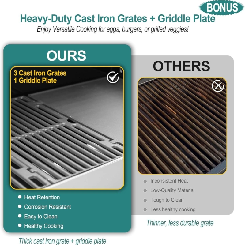【Complete Outdoor BBQ Kitchen Island】Includes two cast iron grates and a griddle plate for pancakes, stir-fry, or other dishes, transforming your backyard into a fully functional outdoor bbq island 【Complete Outdoor BBQ Kitchen Island】Includes two cast iron grates and a griddle plate for pancakes, stir-fry, or other dishes, transforming your backyard into a fully functional outdoor bbq island