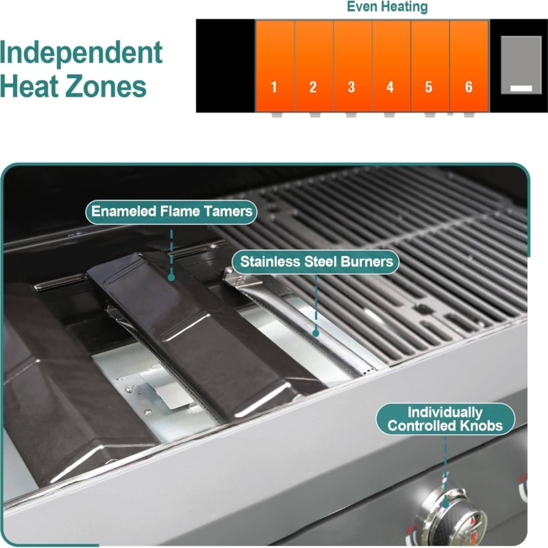 【Powerful Gas Grill with Side Burner】6 stainless steel burners (10,000 BTU each) and a 12,000 BTU side burner deliver 72,000 BTU of even heat for versatile outdoor cooking—perfect for your outdoor kitchen grill setup 【Powerful Gas Grill with Side Burner】6 stainless steel burners (10,000 BTU each) and a 12,000 BTU side burner deliver 72,000 BTU of even heat for versatile outdoor cooking—perfect for your outdoor kitchen grill setup