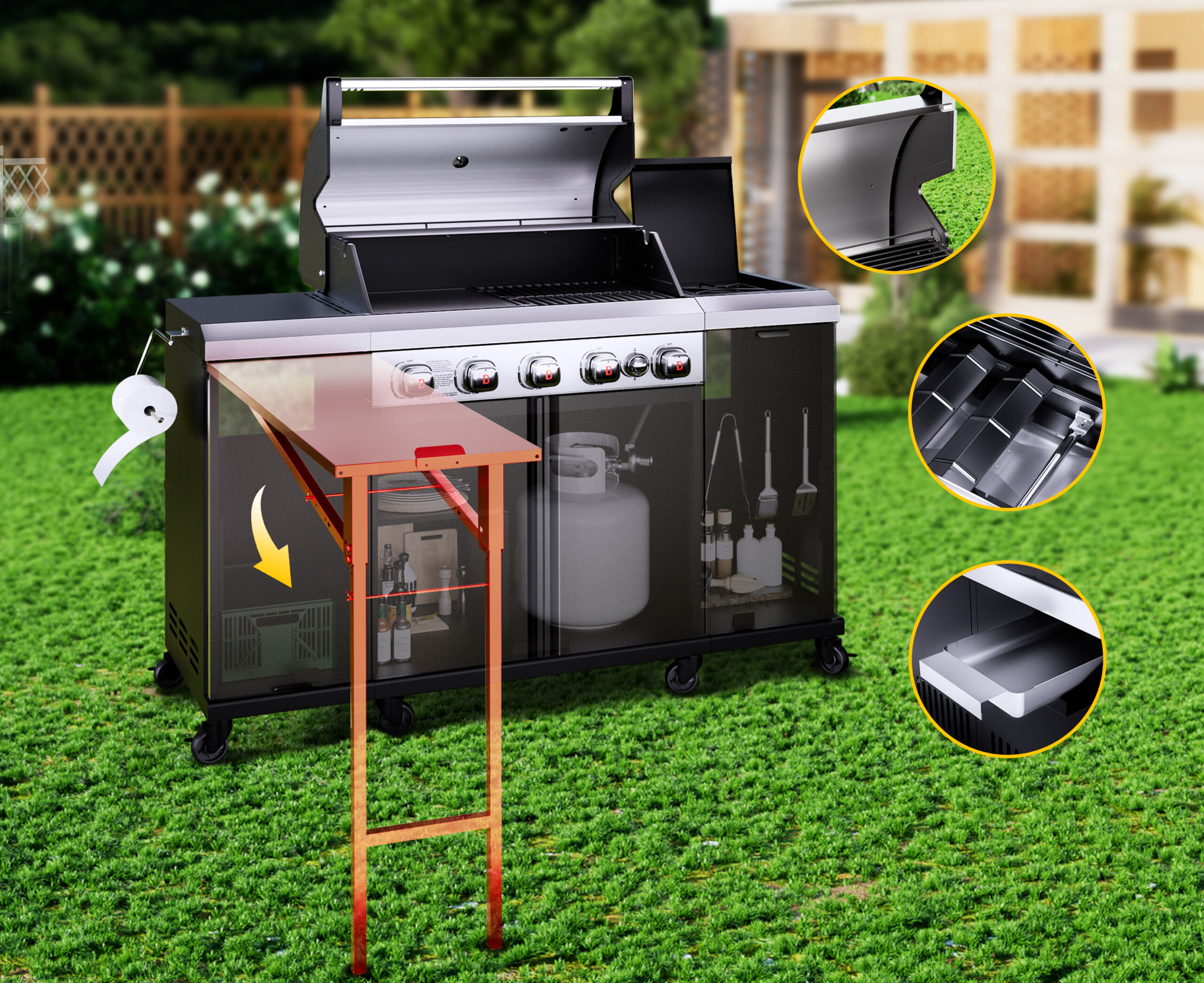 • Prep Station & Storage: Cook and organize effortlessly with our foldable prep station. Enjoy a spacious surface for meal prep that folds away neatly when not in use. The storage below keeps your BBQ tools and ingredients organized and within easy reach