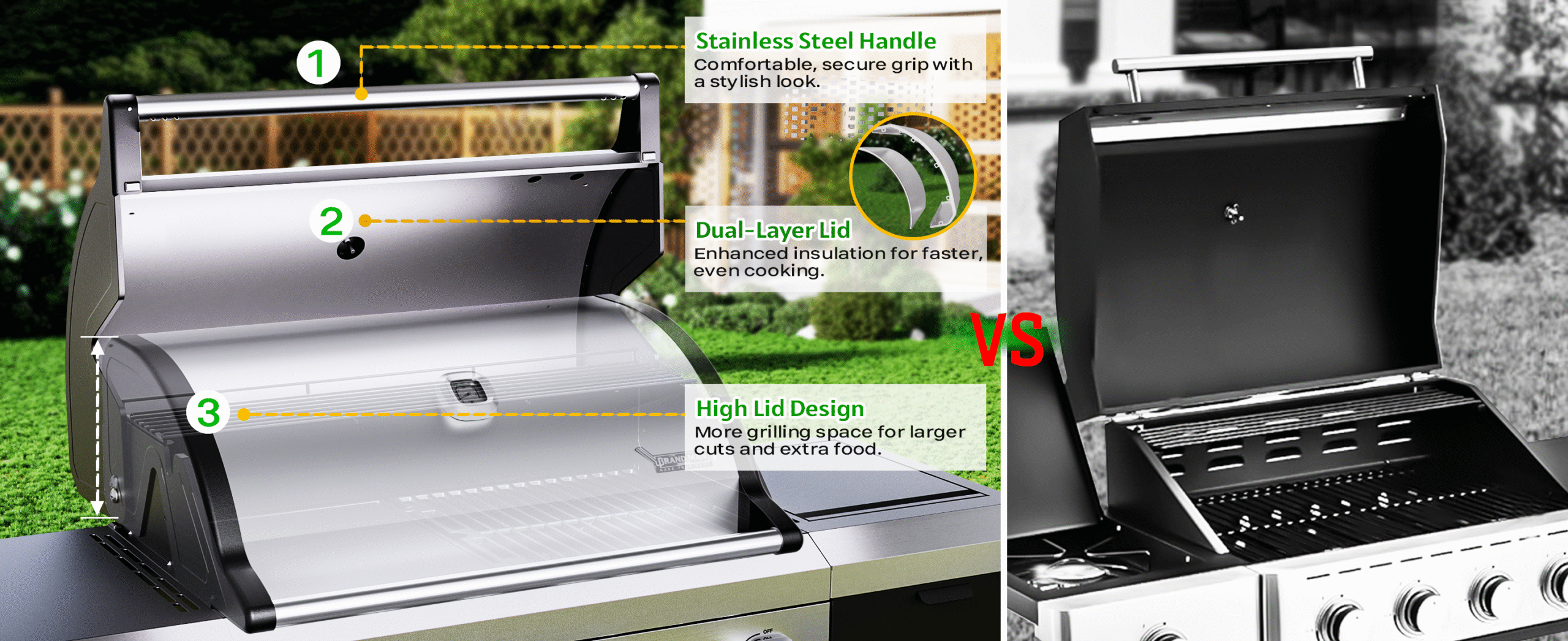 • User-Friendly Features: Enjoy easily controlled knobs, a double-layer lid, stainless steel full-size heat-proof handle, a paper towel holder, tool holder for grilling essentials, a grease tray/cup and LPG/NG Convertible (an optional kit SOLD SEPARATELY), enhancing your grilling experience and convenience